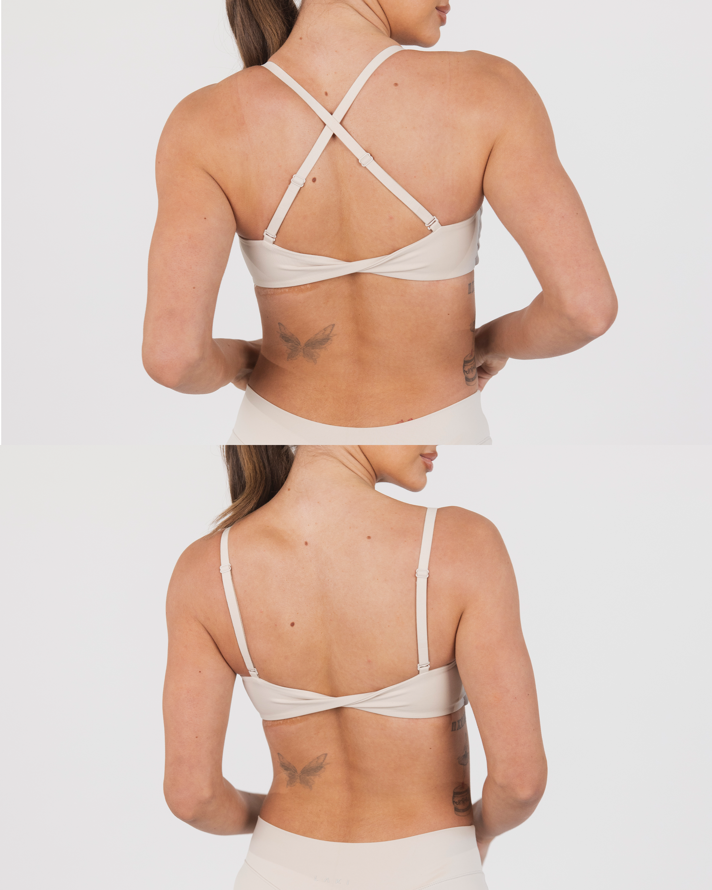 • Removable straps — style 3 ways: halter, criss-cross, or straight back